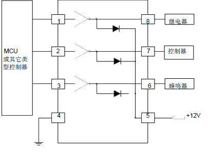 ULN2001D 的每一路達林頓管串聯(lián)一個2.7K 的基極電阻,在 5V 的工作電壓下可直接與TTL/CMOS 電路連接,可直接處理原先需要標準邏輯緩沖器來處理的數(shù)據(jù)。